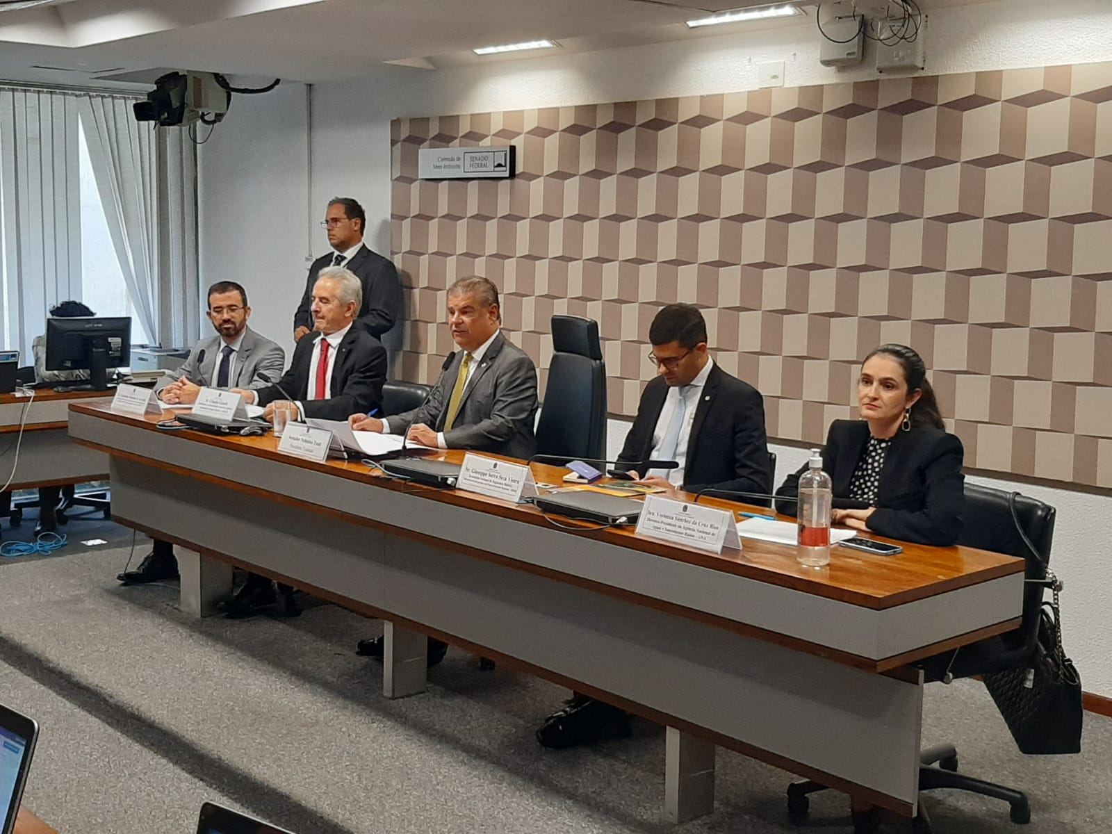Presidida pelo senador Nelsinho Trad, a primeira mesa da audiência pública foi composta por Claudio Girardi, consultor jurídico e membro da Comissão de Assuntos Regulatórios da OAB/DF; Giordano Almeida de Azevedo, coordenador do Grupo Assessor do Modelo Integral de Avaliação Global do Ministério de Ciência e Tecnologia; Giuseppe Serra Seca Vieira, secretário nacional de Segurança Hídrica do Ministério da Integração e do Desenvolvimento Regional; e Veronica Sánchez da Cruz Rios, diretora-presidente da Agência Nacional de Águas e Saneamento Básico (ANA).