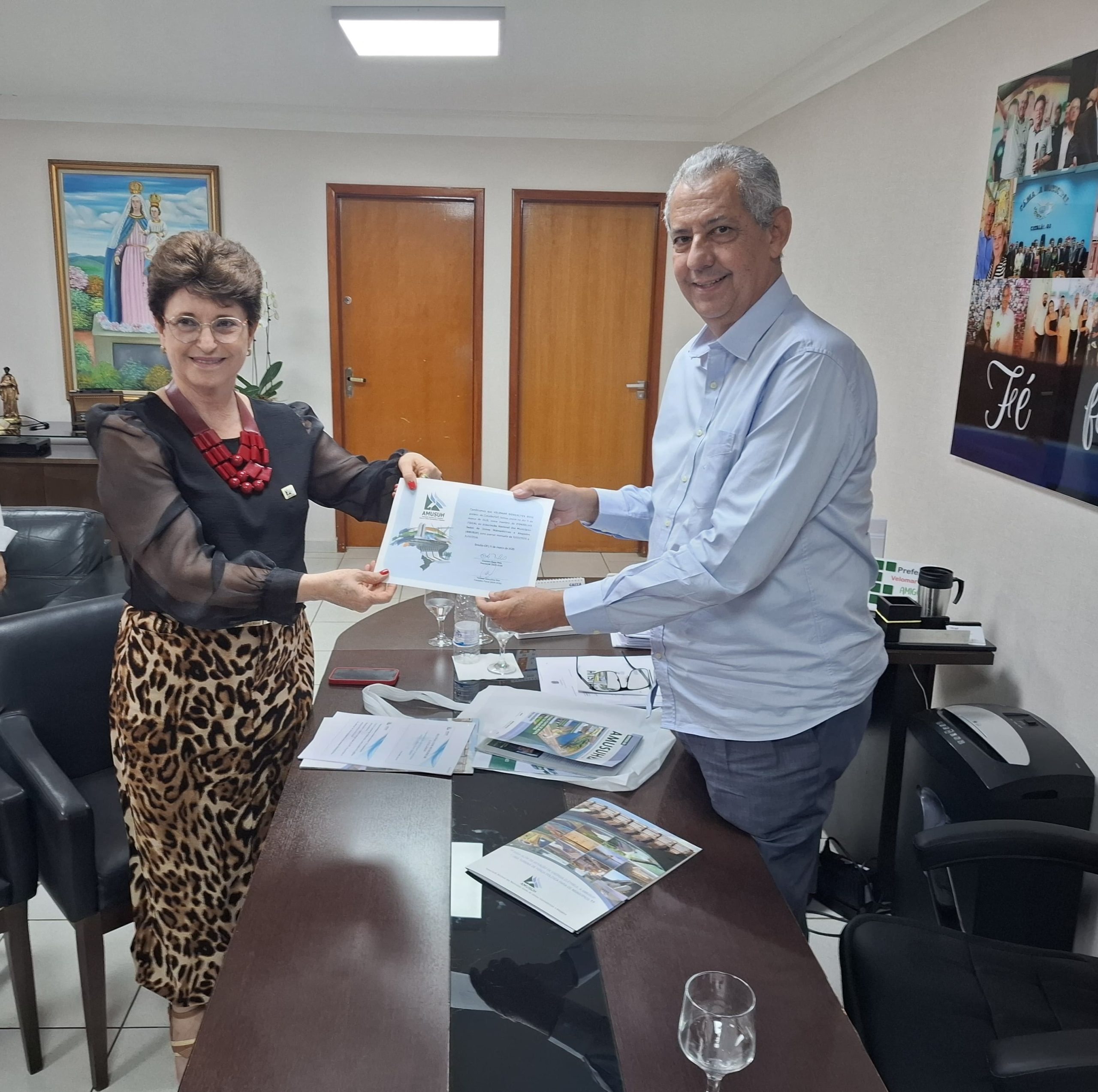 Em outro momento do encontro, a secretaria executiva da Associação, em nome do presidente da AMUSUH, Cassiano Maia, entregou ao prefeito Velomar o certificado de sua investidura como membro do Conselho Fiscal da AMUSUH, uma vez que, por conta de compromissos assumidos anteriormente, ele não pôde estar presente no evento de solenidade de posse do novo quadro dirigente da Associação, ocorrido no dia 11/03.