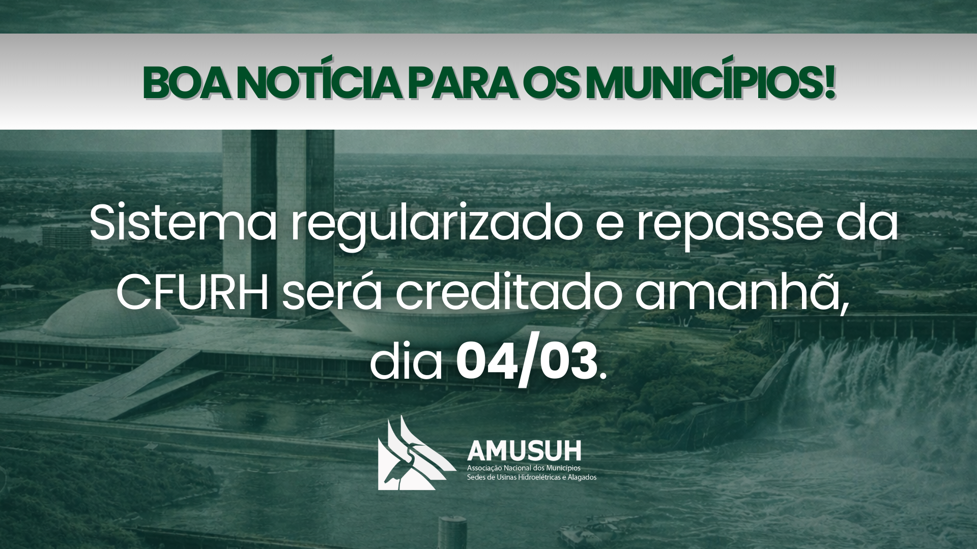 A inconsistência no sistema responsável pelo processamento do repasse da CFURH já foi solucionada.